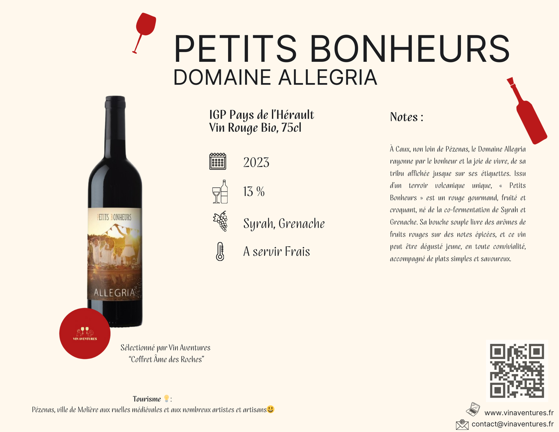 D'un côté on trouve les roches volcaniques de Caux avec 'Petits Bonheurs', de l'autre, les schistes, marnes et argiles du Minervois, d’où le nom de la cuvée ‘Les Trois Cailloux’, et surtout un cépage commun le Syrah, mais qui, accompagné de Grenache dans un cas et de Carignan pour l'autre, vous apportera des arômes bien différents, mais ne vous laissera pas insensible dans tous les cas…
