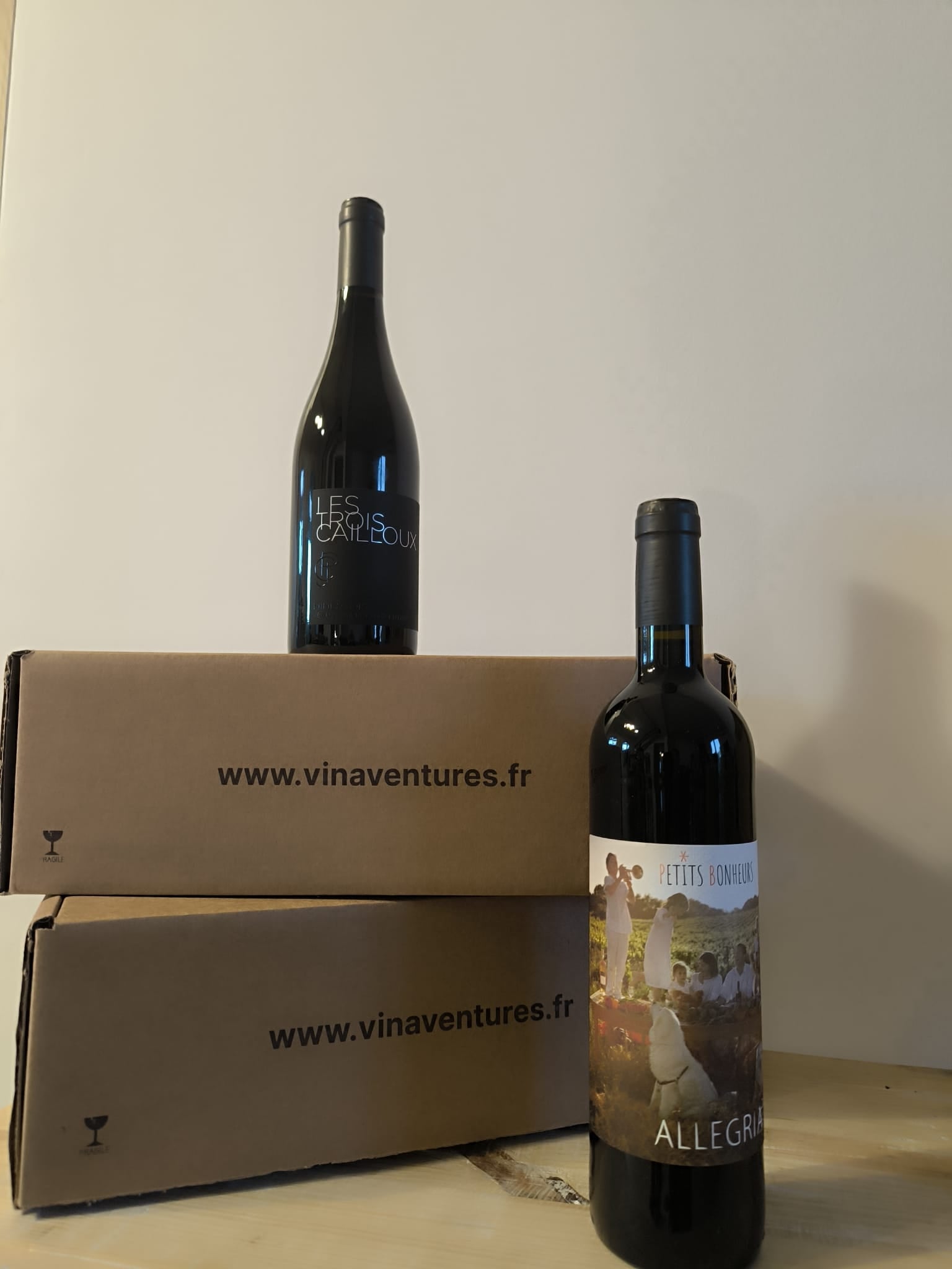 D'un côté on trouve les roches volcaniques de Caux avec 'Petits Bonheurs', de l'autre, les schistes, marnes et argiles du Minervois (d’où le nom de la cuvée ‘Les Trois Cailloux’), et surtout, on trouve un cépage commun : le Syrah, mais qui, accompagné de Grenache pour l'un et de Carignan pour l'autre, vous apportera des arômes bien différents, mais ne vous laissera pas insensible dans tous les cas…