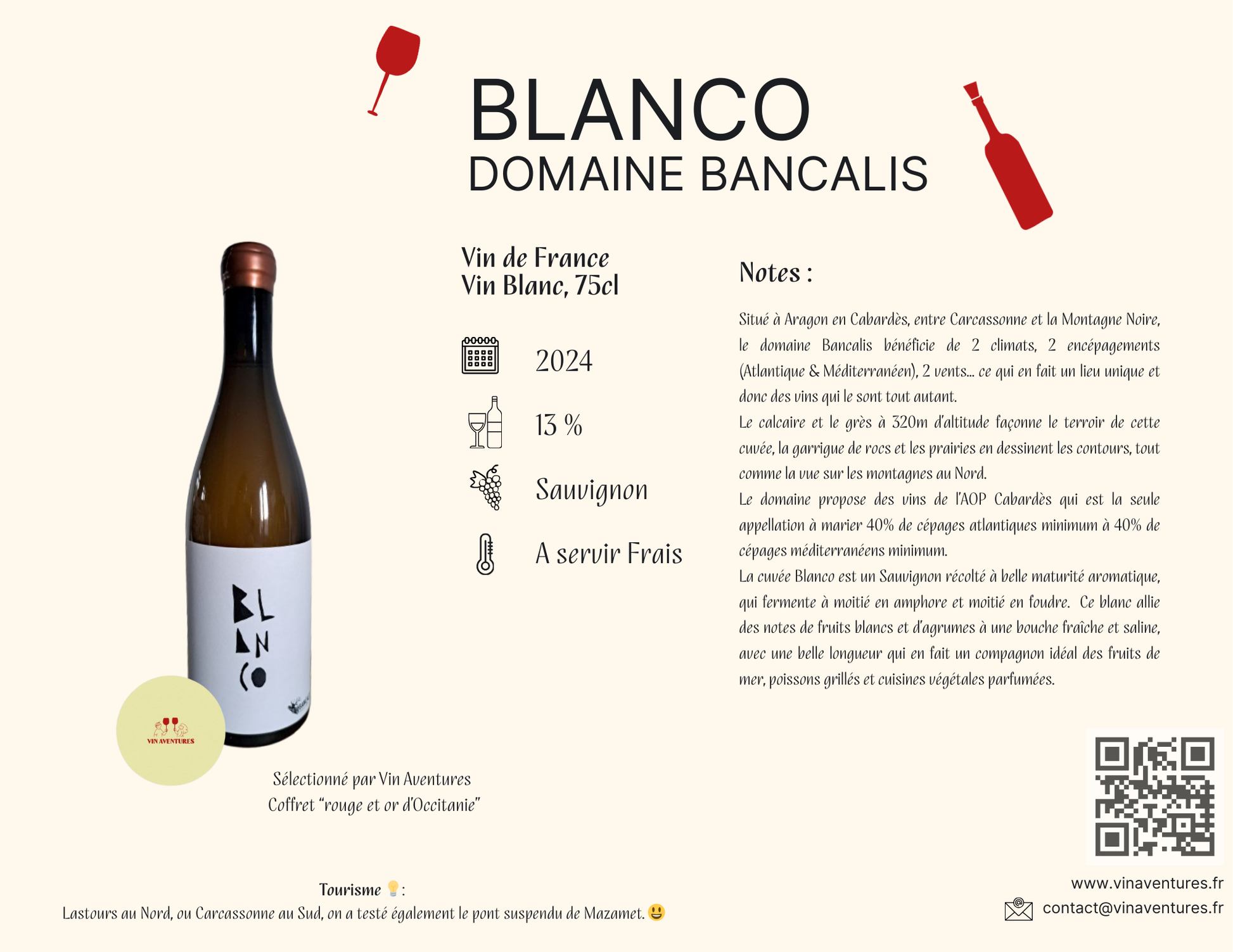 D'un côté, un vin Blanc, La cuvée "Blanco" du Domaine de Bancalis, à Aragon dans le pays du Cabardès.